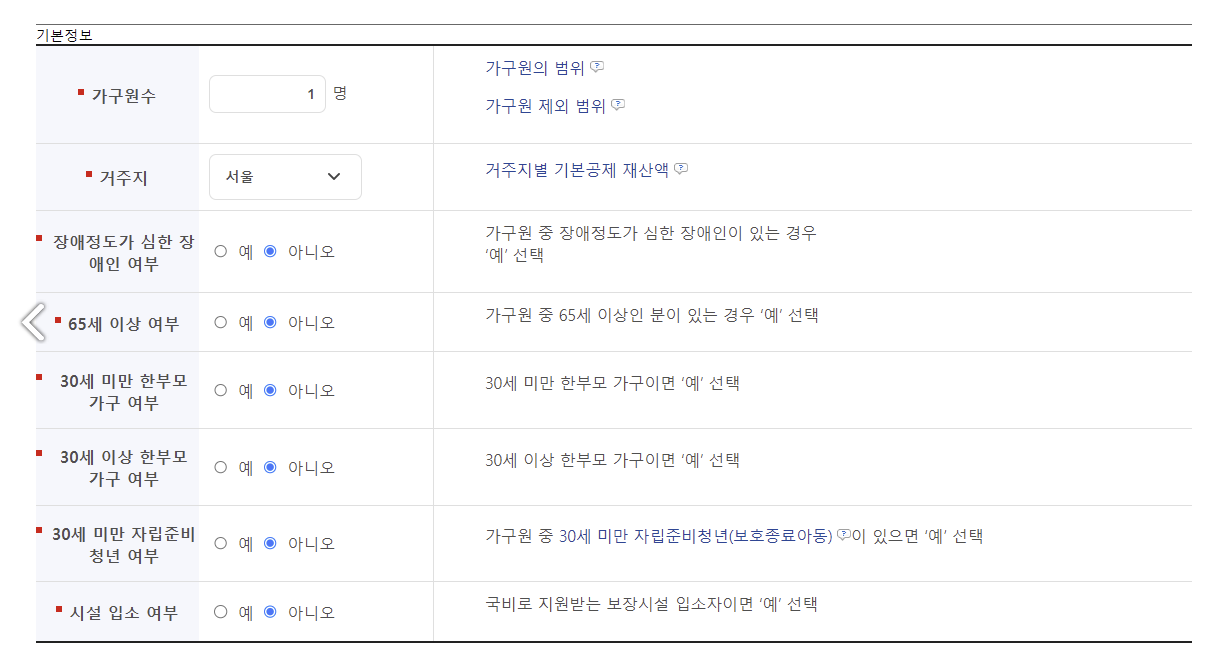 기초생활수급자 자격요건을 확인하기 위해서 먼저 자신의 기본정보를 입력해야 합니다.
