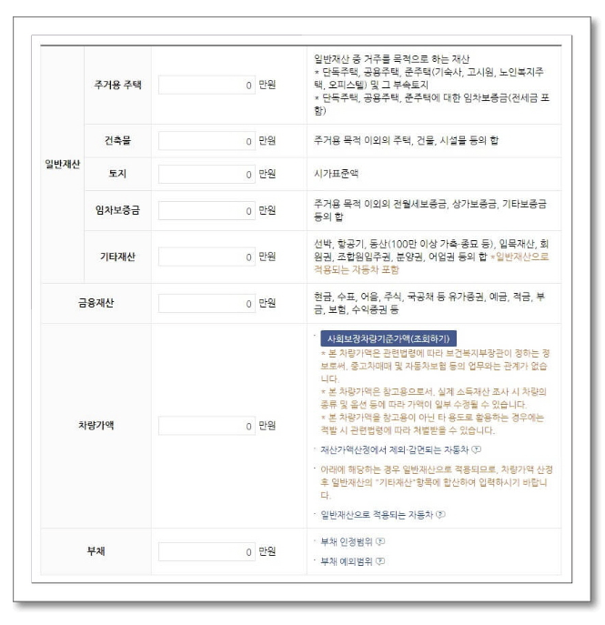 기초생활수급자 자격요건을 알아보기위한 마지막 단계는 일반재산 입력입니다. 일반재산인 주택,건물,보증금,금융재산,자동차등을 입력합니다.